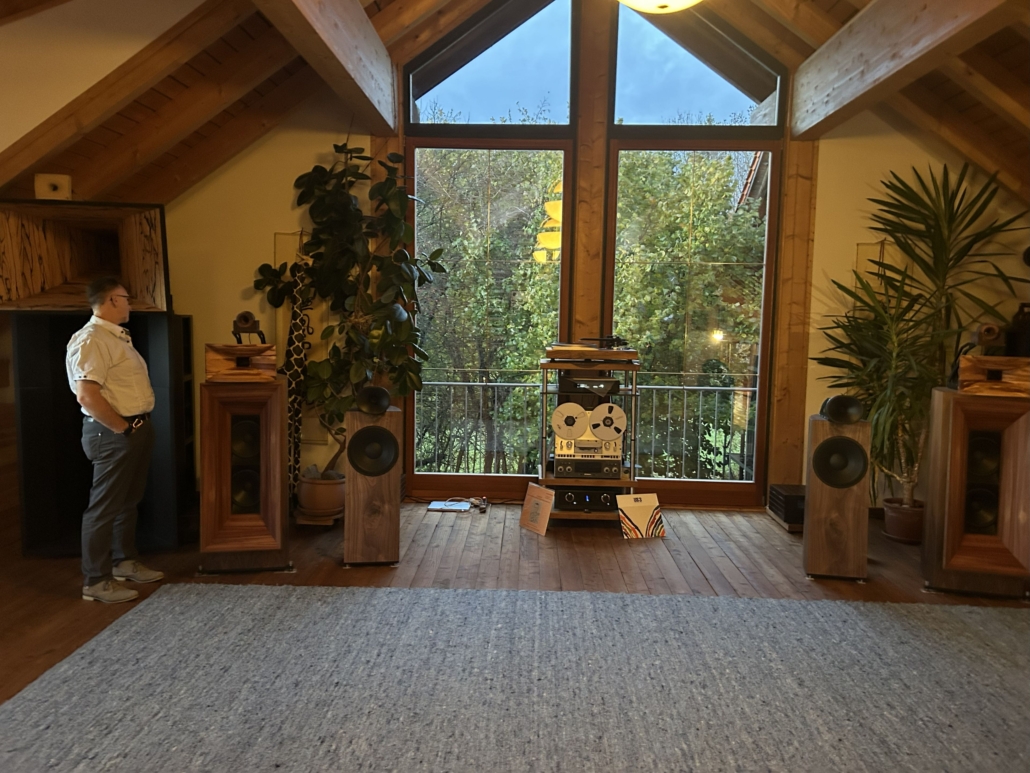 haben wir die verschiedenen Lautsprecherkonzepte, je eine ganz brandaktuelle Modifikation als auch ein ganz neues Modell hören können. Hierzu sind im Dachgeschoss des Hauses zwei unabhängige High End-Anlagen installiert. Der große Raum ist akustisch sehr neutral, obwohl es gar nicht danach aussieht. Hier fehlen schlicht die ansonsten drapierten akustisch wirksamen Formteile wie Absorber, Diffusoren und Bassfallen, ganz einfach weil diese durch besondere Dämmmaßnahmen akustisch erst gar nicht nötig wurden. Tatsächlich wird die finale tonale Abstimmung aller neu entwickelten Lautsprecher hier oben vorgenommen.*****