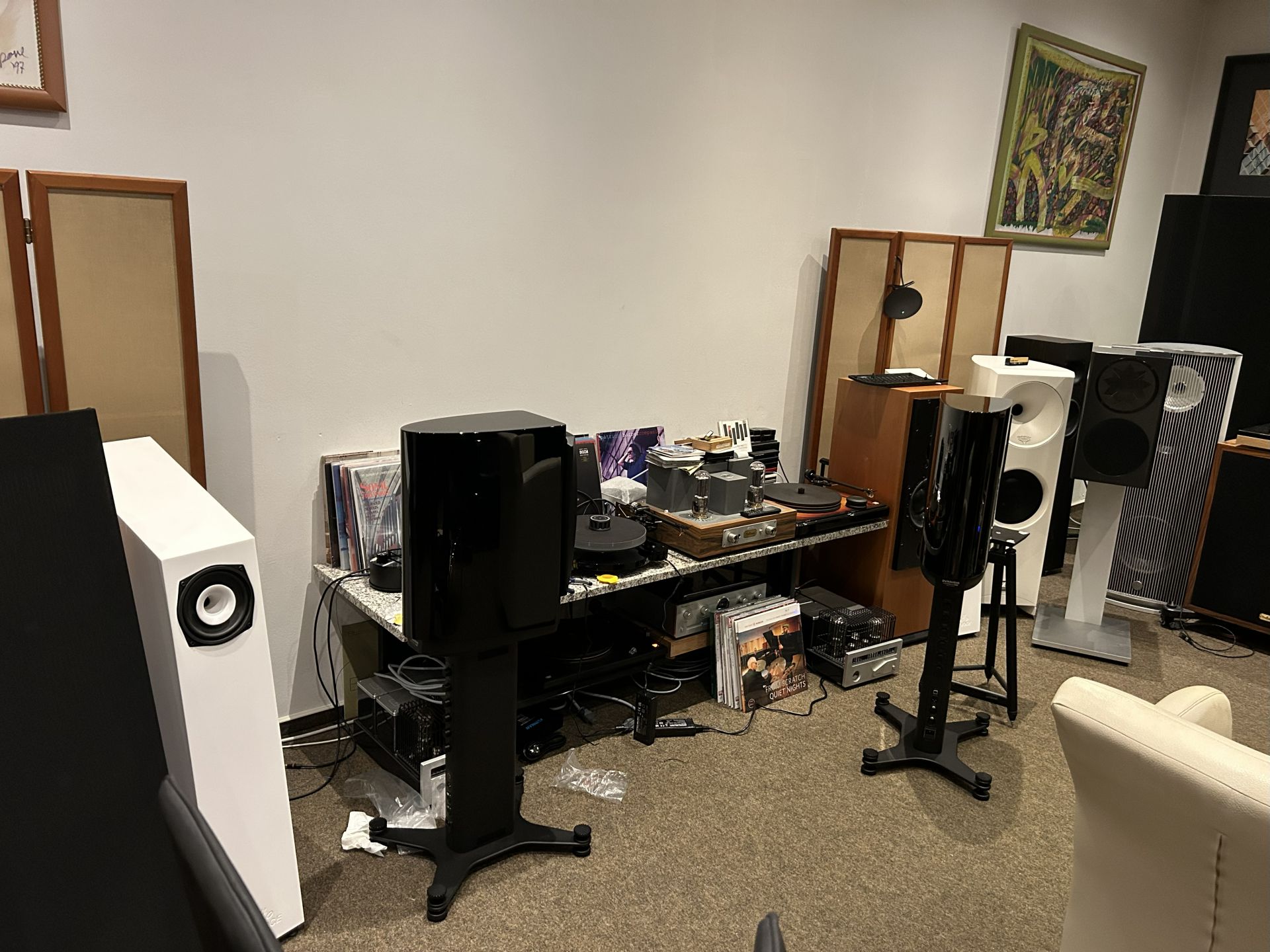 Diese haben wir angesichts des großen Raumes und der nicht gegebenen Möglichkeit, die Manger Audio c1 relativ Wand-nah zu stellen, um die LF-Module******* ergänzt. Diese werden einfach oben auf die c1 gestellt, passgenau ausgerichtet und mit einem kurzen Kabel mit der Hauptbox verbunden. Jetzt musste man nur noch einen Schalter hinten auf dem Elektronik-Einschub umlegen, damit dessen Belastung wieder Impedanz-gerecht wird, und schon kann es losgehen.