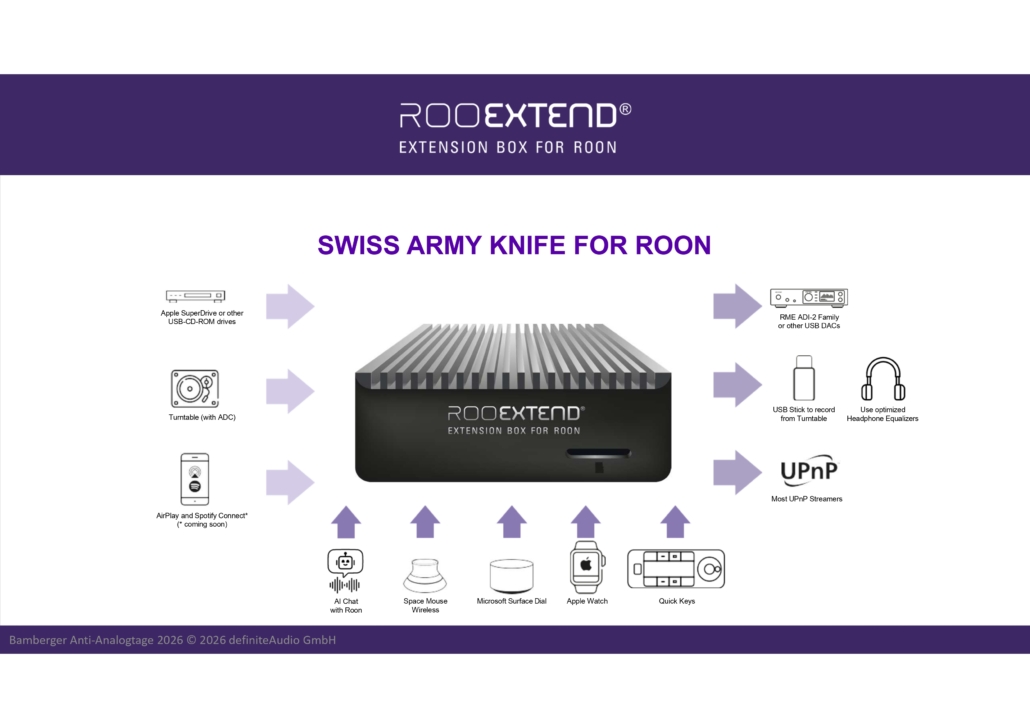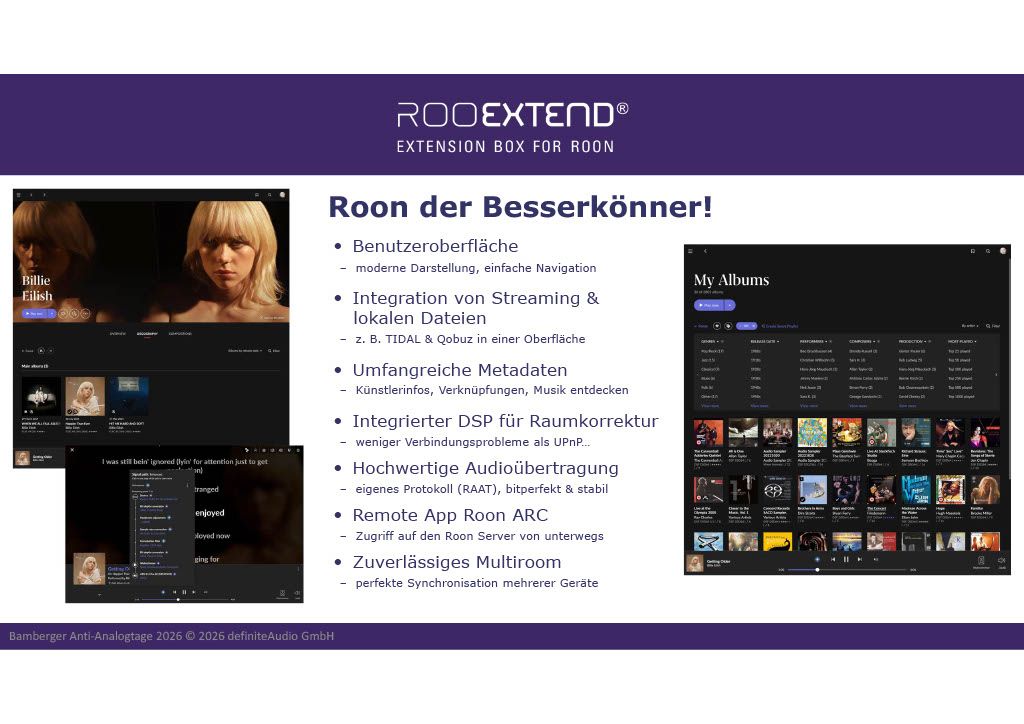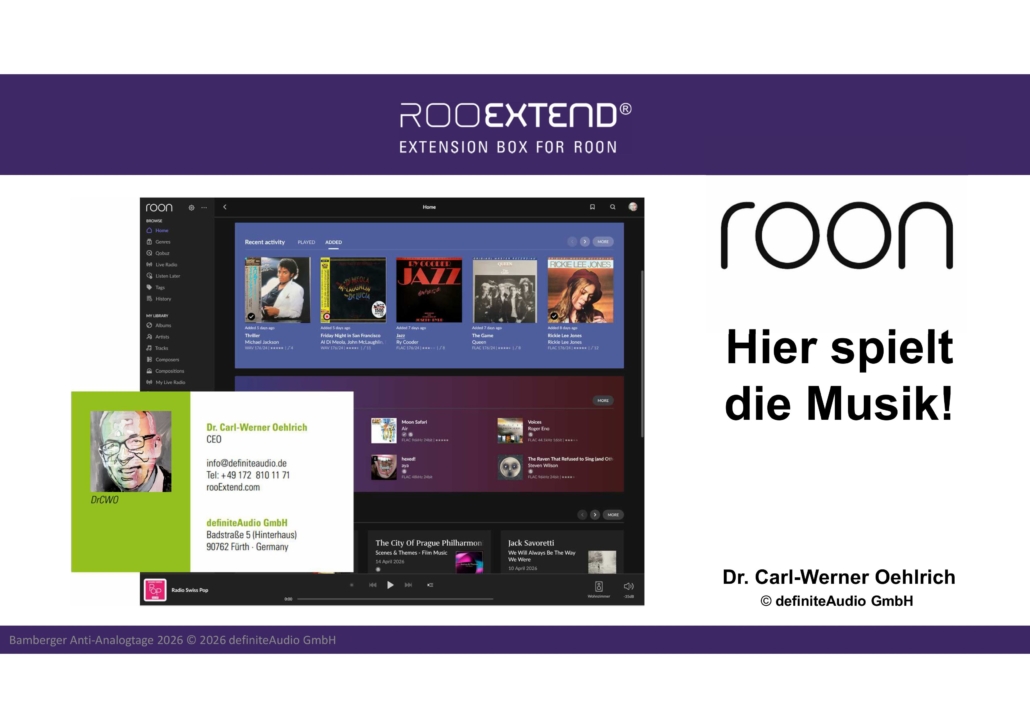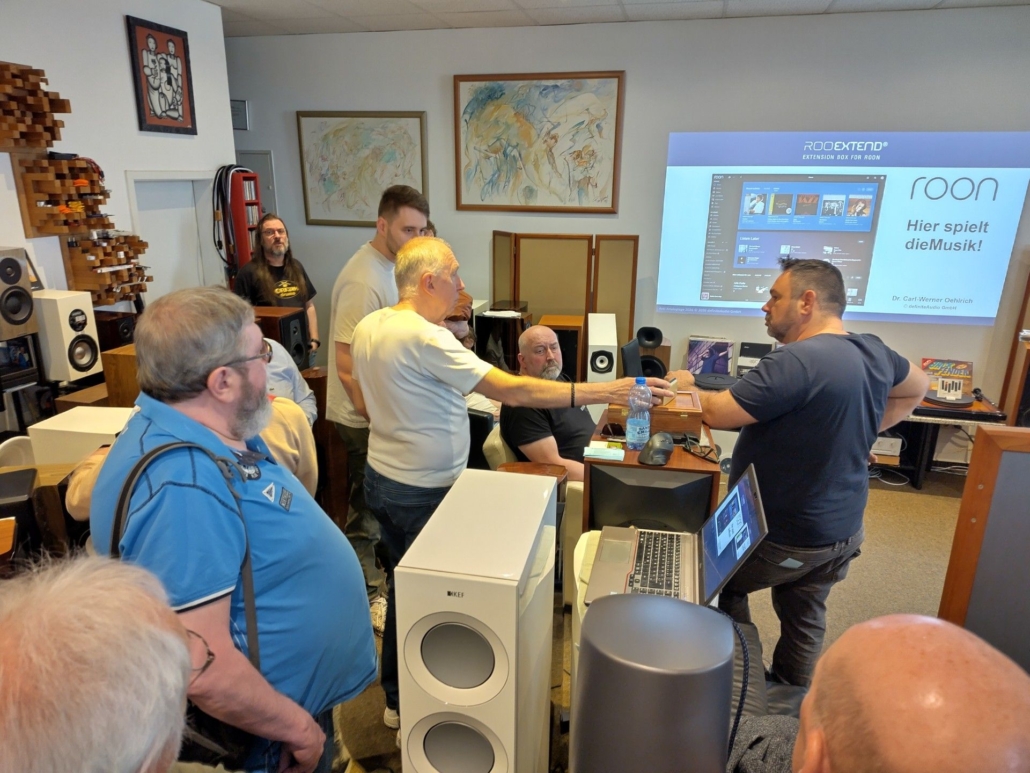 Da fehlt nur noch Dr. Charly alias Doktor Carl-Werner Oehlrich, der diesmal und erstmals bei einer Veranstaltung des FLSV in Bamberg als Moderator**** das Große Vorführstudio bespielte. Seine detaillierten Ausführungen zu Roon allgemein als mächtigstem Player digitaler Musik, zum passenden Zubehör RooExtend Box und zu den Möglichkeiten, vielerlei Erweiterungen wie zum Beispiel eine präzise Raumakustik-Korrektur dort einzubinden, haben alle unsere Gäste nicht nur bisschen schlauer, weil informierter nach Hause gehen lassen. Und zudem mit einem Gutschein für eine kostenlose Raumakustik-Messung im heimischen Hörraum.