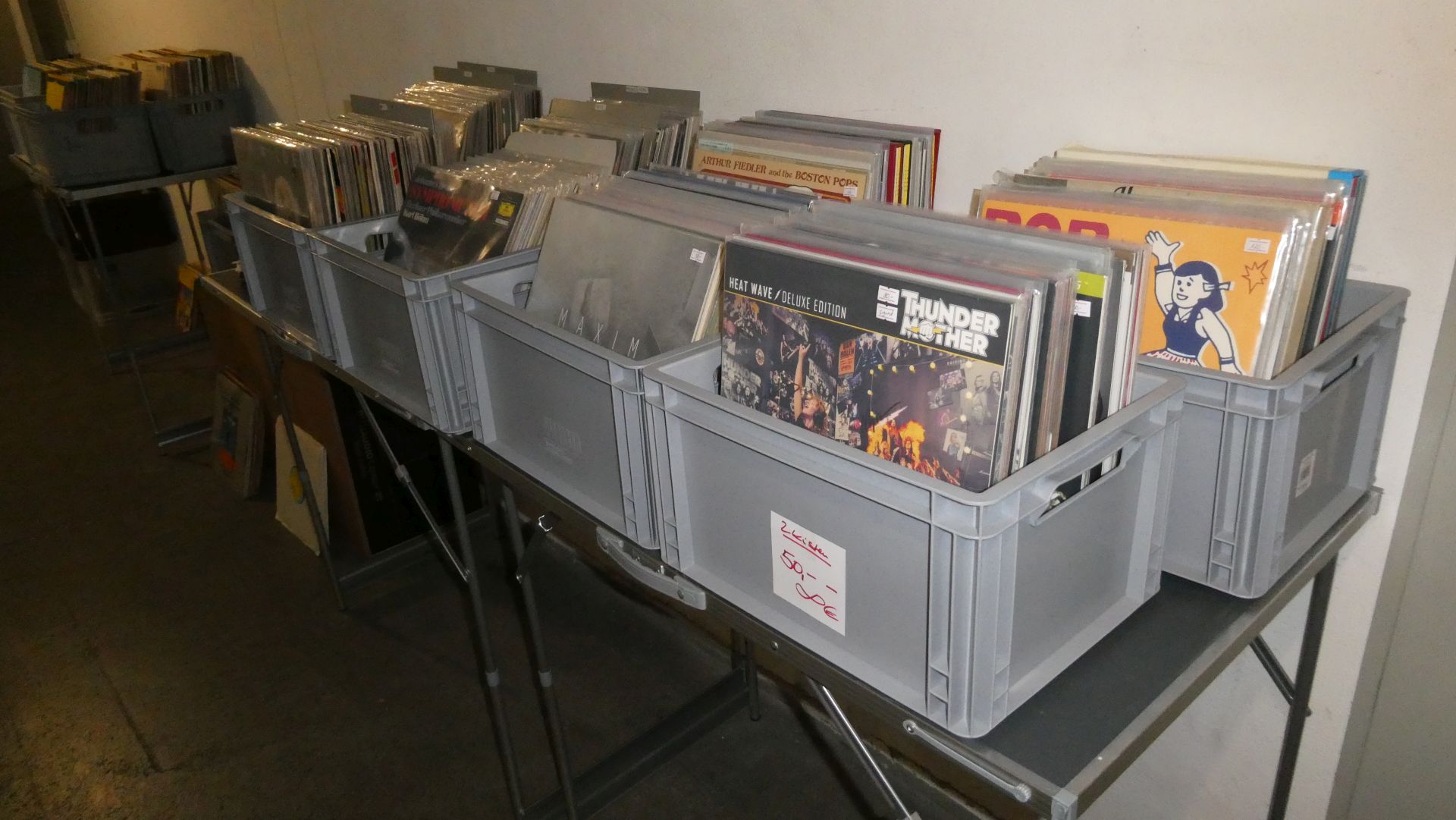 Aber nach einer kleinen Weile stand das Regal fertig aufgebaut im Untergeschoss des Imperiums des FLSV. Das war nämlich der zweite Teil der guten Idee, nämlich dass alle Schallplatten, und das sind inzwischen richtig viele geworden, dort auf Tischen und eben in diesem Regal Platz finden würden. Hier sollte wenigstens ansatzweise gezeigt werden, wie man mit Schallplatten auch in größerer Anzahl und einer entsprechenden Stereo-Anlage stilvoll wohnen kann. Auch wenn das Ambiente des Kellergangs selbstredend keinen Wohnraum-Charme ausstrahlen kann, wurde von allen Gästen der Veranstaltung das clevere Konzept nachvollzogen.